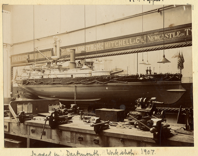 This photograph of a model of HMS Victoria comes from a collection of 5 x 4 inch glass negatives dating from around 1900. They were taken by a Royal Naval cadet and show a remarkable level of skill considering he would have been using a bellows camera on a tripod. Other images from the collection show views of a cruiser taken from the crows nest and I can imagine him struggling up the mast with his awkward load.