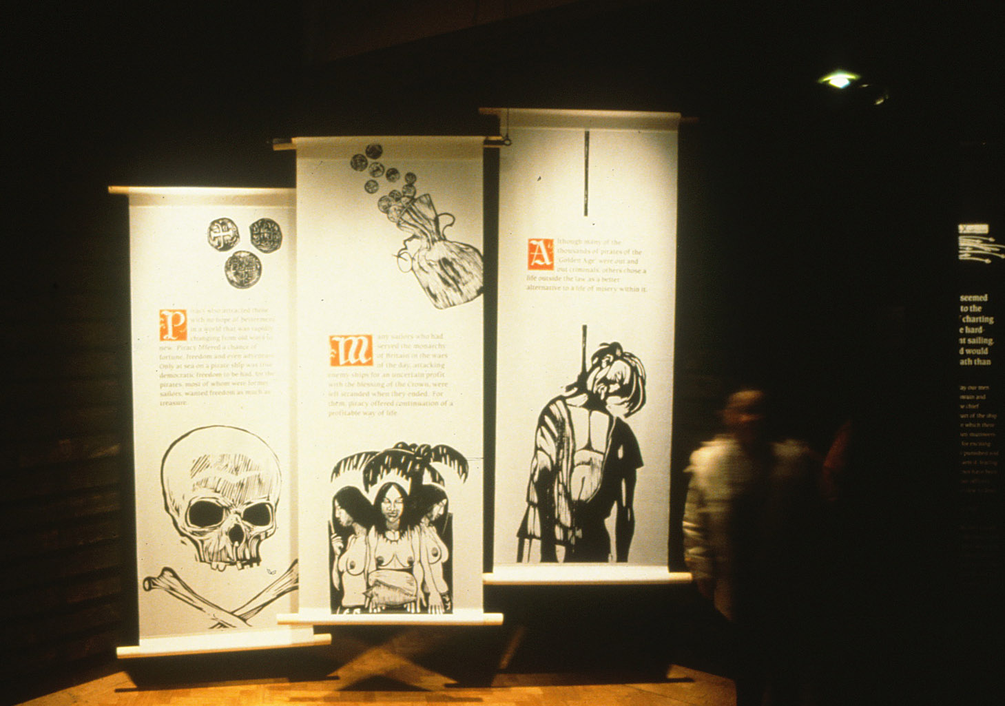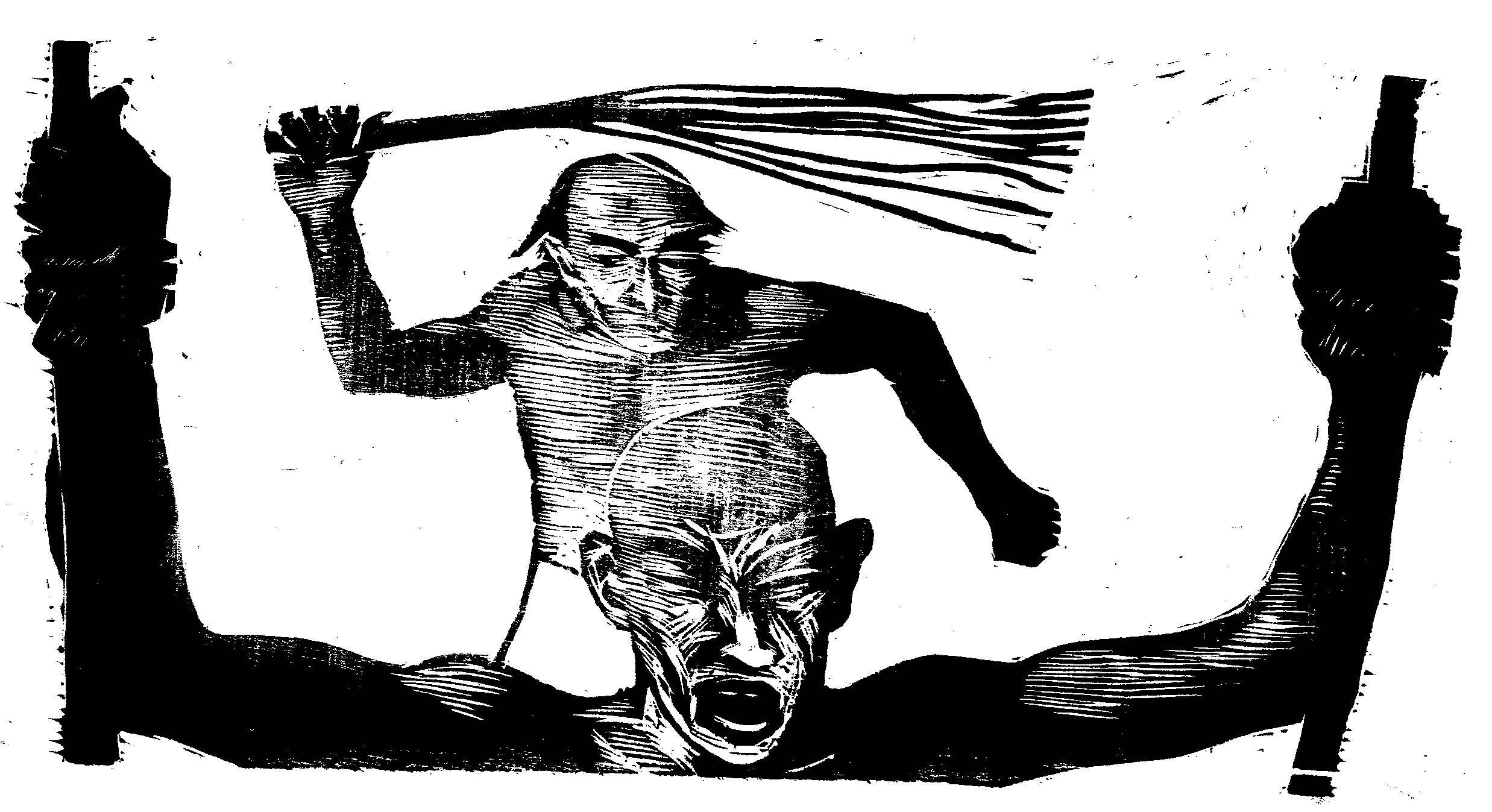 Woodcuts illustrating aspects of the story enlarged and screenprinted onto banners. City Art Centre, Edinburgh.